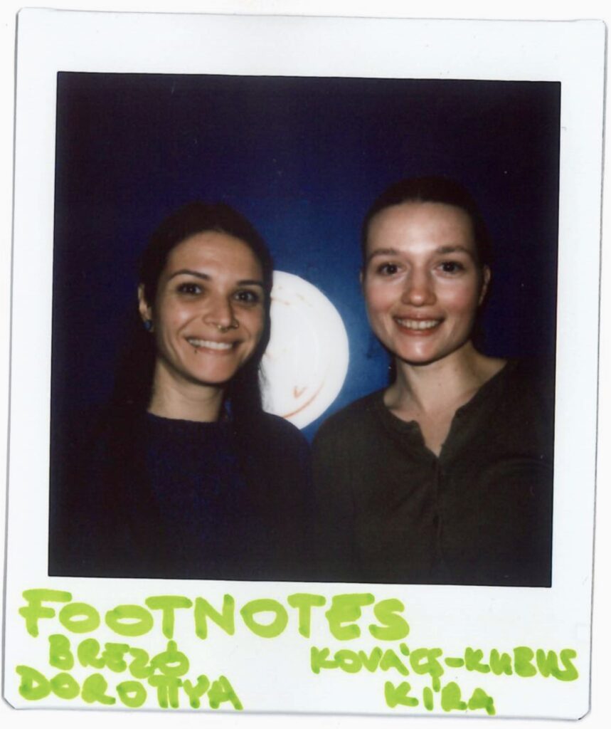 A FootNotes egy kis fészek, egy töltőállomás, ahová haza lehet érkezni, ahol megmerítkezünk a mozgás örömében, egymás elfogadó tekintetében, a csoportok támogató szellemében és felfrissülve lépünk ki a betonvalóságba. (Zsófi Barbarics)